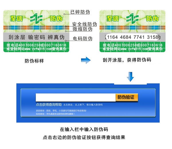 拿到加入至信查询系统防伪标签---刮开涂层---获取到防伪电码---通过拔打电话4007006250或8007160616若登陆至信防伪网www.zxfw315.com,将防伪电码从左到右,从上到下依次输入防伪验证框后,点击“防伪验证”按钮获得查询结果。