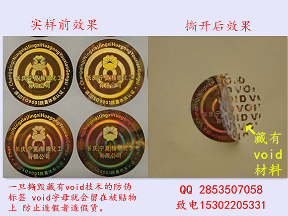 标签一旦揭开后内容就会留在被贴物上面、以证明此物品已经被他人打开过、此标签在不同的角度上看去显示不同的镭射彩虹效果