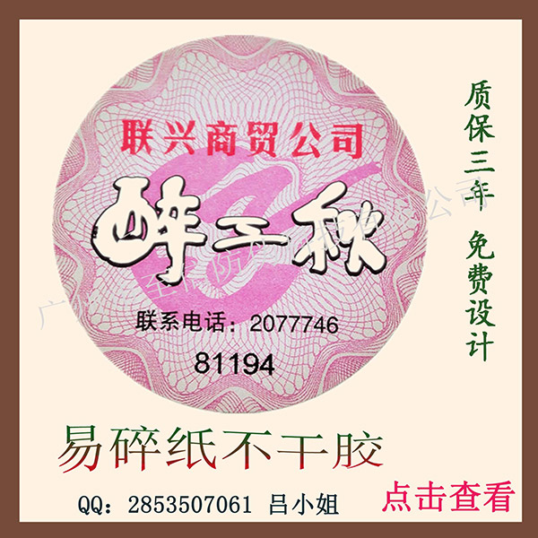 买过药品、食品、化妆品、电子产品的人都知道,在使用产品之前,包装封口上面都有一张封口标签,这种标签不能完好无损的揭开,只要揭开就一定会被破坏,不能重复使用,这样就起到了一个防转移防开启的作用。如图所示,“醉三秋”此标签采用的就是易碎纸材质,此种材质以易碎印刷材料为面料,背面是强力胶粘剂,以涂硅保护纸...