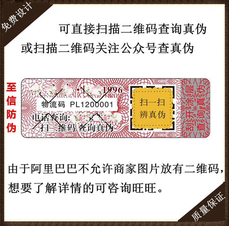 标签上是防伪查询网站二维码,扫描二维码进入防伪查询网站,输入防伪码立即显示查询结果。标签设计:表面可放置公司名称、logo、官网、网址等需要显示的内容;防伪途径:防伪查询电话(4006572315)及防伪网站(www.cn315fw.com);二维码内容:可连接微信公众号、公司官方网站、天猫淘宝店铺...