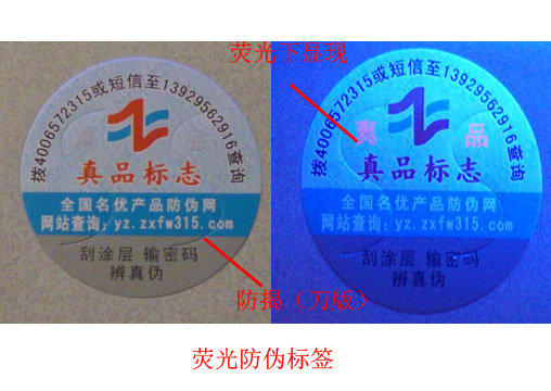 荧光防伪标签:荧光技术是一种特殊油墨印刷,通常使用印刷在纸质不干胶、铜板纸、激光标签上面。我们通常常用的有荧光无色变红、荧光无色变绿两种。荧光油墨通过荧光灯照射可以显现出事先有荧光油墨印刷的内容。