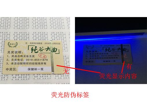 荧光防伪标签:荧光技术是一种特殊油墨印刷,通常使用印刷在纸质不干胶、铜板纸、激光标签上面。我们通常常用的有荧光无色变红、荧光无色变绿两种。荧光油墨通过荧光灯照射可以显现出事先有荧光油墨印刷的内容。