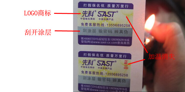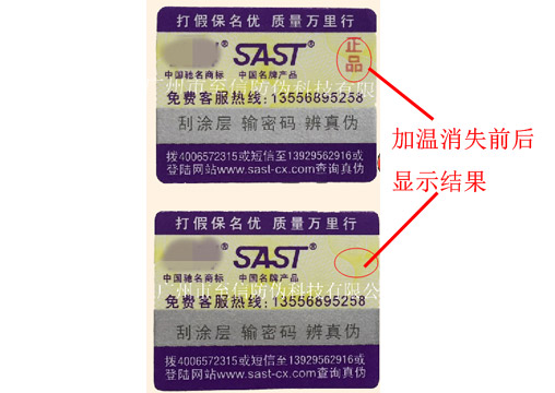 高温消失防伪标:主要作用于纸质不干胶、铜版纸、激光材质上面。是一种特殊油墨。一般印刷的颜色为红色、黑色。平常看印刷的内容与其他无异,也是做为一种隐藏性防伪技术使用。一般要注意的是带了高温消失技术的,过膜的实用效果。