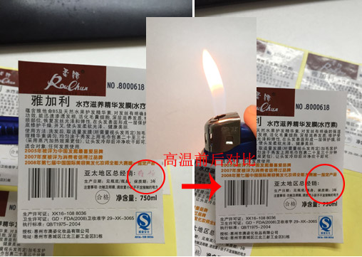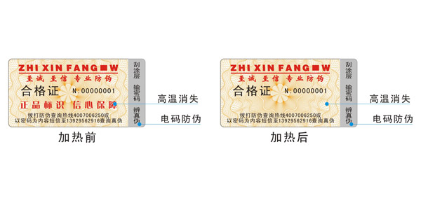 高温消失防伪标:主要作用于纸质不干胶、铜版纸、激光材质上面。是一种特殊油墨。一般印刷的颜色为红色、黑色。平常看印刷的内容与其他无异,也是做为一种隐藏性防伪技术使用。一般要注意的是带了高温消失技术的,过膜的实用效果。
