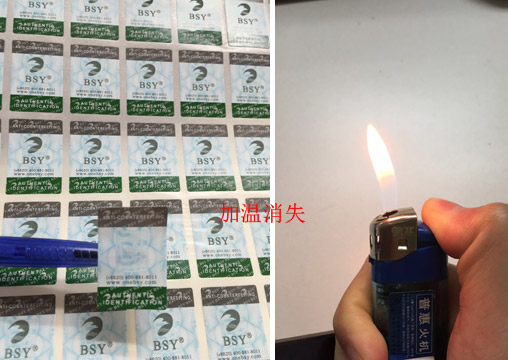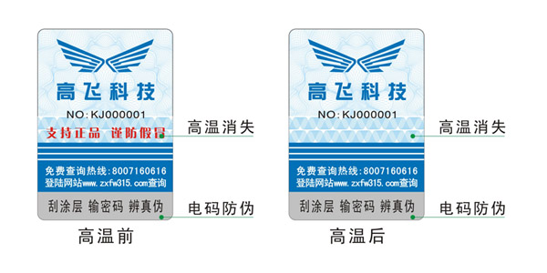 高温消失防伪标:主要作用于纸质不干胶、铜版纸、激光材质上面。是一种特殊油墨。一般印刷的颜色为红色、黑色。平常看印刷的内容与其他无异,也是做为一种隐藏性防伪技术使用。一般要注意的是带了高温消失技术的,过膜的实用效果。