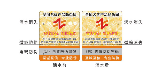滴水消失防伪标签:也是做为一种隐藏性防伪技术,一般常见使用在纸质不干胶 、铜版纸上面,印刷颜色以白色印刷。当水滴在用滴水消失油墨印刷的内容上面时,印刷内容会发生改变,会消失,等水干后,消失的内容又会显现出来。 要注意的是带滴水消失表面是不过膜的。