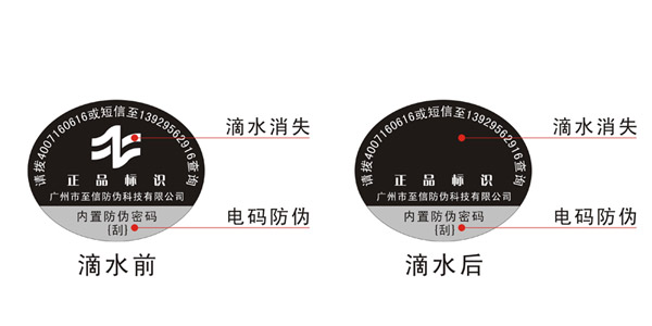 滴水消失防伪标签是一种比较先进的防伪技术,滴水消失防伪标签是靠增加特殊的印刷油墨和特殊的制版工艺来实现的,同时将文字或图案隐藏,以及肉眼无法看到,只能借用水滴以此来和油墨发生相互的化学反应达到滴水消失的效果。