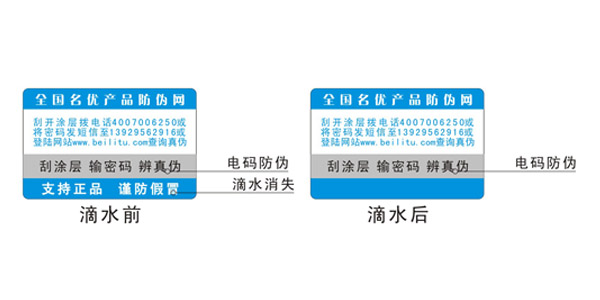 滴水消失防伪标签:也是做为一种隐藏性防伪技术,一般常见使用在纸质不干胶 、铜版纸上面,印刷颜色以白色印刷。当水滴在用滴水消失油墨印刷的内容上面时,印刷内容会发生改变,会消失,等水干后,消失的内容又会显现出来。 要注意的是带滴水消失表面是不过膜的