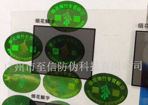 表面看不到隐藏的字体或图案,只有将解码片轻压在标签上,沿顺时针或逆时针方向轻轻旋转解码片,光栅码即可见到隐藏的字体或图案。绿色激光标,整个标签都是绿色的激光效果,一次性激光标,是预防撕下来二次转移,一撕就碎。(颜色可根据客户要求定制)