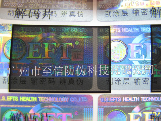 光栅防伪也是解码防伪、莫尔加密防伪,表面看不到隐藏的字体或图案,只有将解码片轻压在标签上,沿顺时针或逆时针方向轻轻旋转解码片,光栅码即可见到隐藏的字体或图案。银色激光标,整个标签都是银色的激光效果,一次性激光标,是预防撕下来二次转移,一撕就碎。