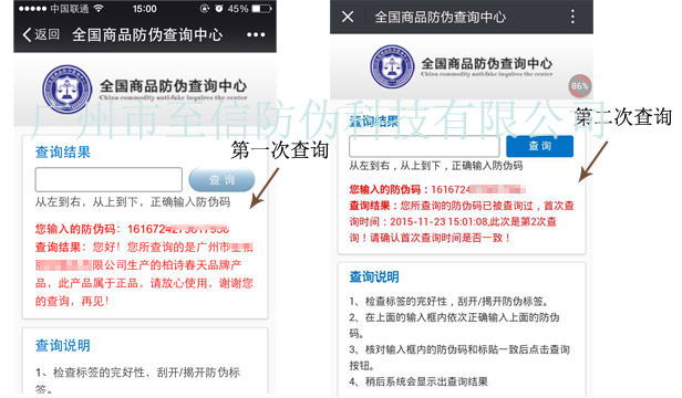 2、查询第二次提示:您好!您所查询的防伪码已经查询过,首次查询时间于x年x月x日x时x分X
