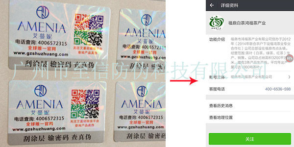 扫描标签上彩色二维码,关注微信公众号后方可查询产品真伪,通过微信公众号可促销活动、宣传公司信息、介绍产品等,零成本宣传,方便快捷。