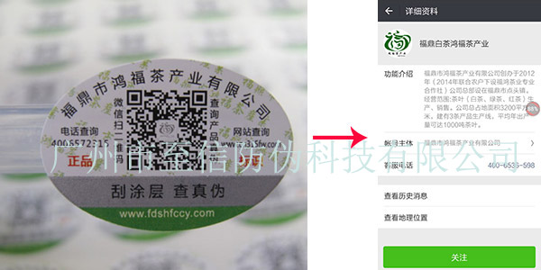标签上是微信公众号二维码,扫描二维码关注微信后才可进行防伪查询。可增加粉丝,打击仿冒。