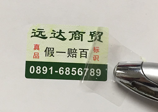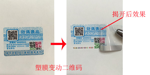 塑膜防伪标签:同样具备带防伪密码,可印刷固定二维码、微信查询方式等,对于变动二维码的话 就有所保留,印刷撕开后二维码会破坏影响扫描。防伪涂层是丝印在塑膜表面的。