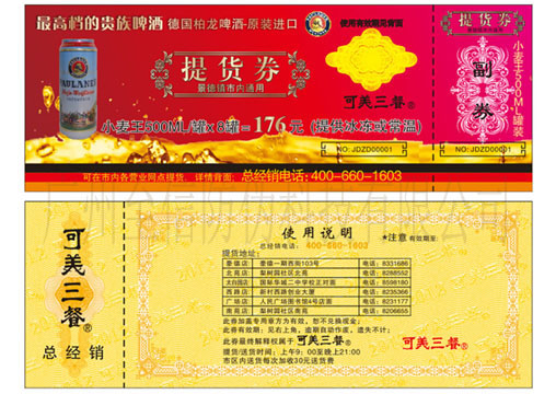3、提货券的一般分为正面、背面 ,双面印刷的称为双铜,也可以只正面印刷称为单铜;
