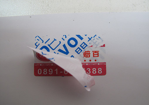 3、 防揭封口标签从承粘物表面撕下时,基材预先设定的文字或图案被分离出基材并完整地保留在承贴物表面,撕开后的基材与字模无法复原。