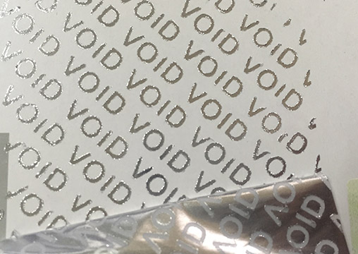 在材料反面经特殊工艺加工形成一种字模(通常的字模有“VOID”、“OPENED”、已开封或客户指定的专版),当标签从承贴物表面撕起时,预先设定的字模或图案将会完整地留在承贴物表面,且无法复原并留在被贴物上,从而达到保真的目的,并提供自动检验的功能,具有一揭即损,一损即现,一现。产品采用面材可制成哑银、光银、闪银、激光、白色等多种色彩透明、不透明的材料。下图是哑银材料: