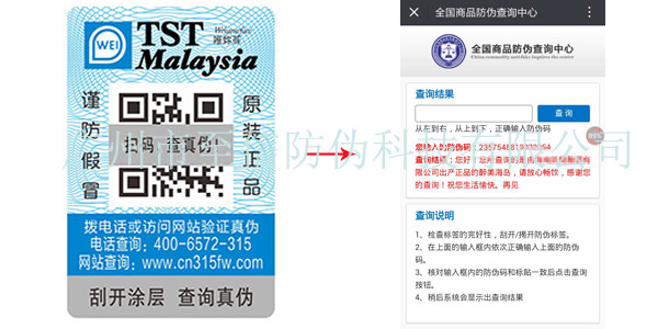 标签上是防伪查询网站二维码,扫描进入防伪查询网站即可显示查询结果,辨别产品真假,无需手动输入防伪码,方便快捷。