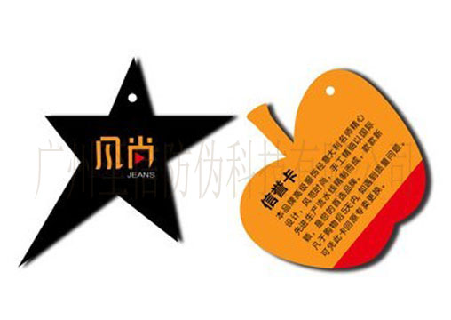 防伪吊牌是以特种防伪钞券纸(安全线纸或水印纸)为基础,结合安全图文设计、特种印刷(雕刻凹版)、特种油墨(OVI光变油墨)专门制作的防伪吊牌,我们广州市至信防伪科技有限公司还可以根据企业的要求来专门定制防伪吊牌。