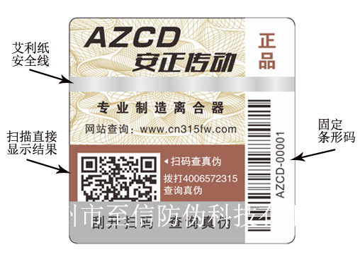 动态二维码防伪标签设计:可放置公司名称、logo、网址、二维码(黑色或彩色)、条形码、流水号灯内容。