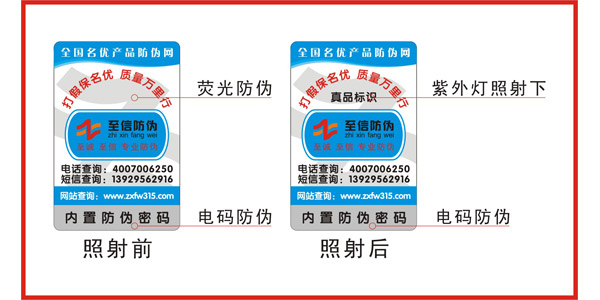 荧光防伪标签:荧光技术是一种特殊油墨印刷,通常使用印刷在纸质不干胶、铜板纸、激光标签上面。我们通常常用的有荧光无色变红、荧光无色变绿两种。荧光油墨通过荧光灯照射可以显现出事先有荧光油墨印刷的内容。